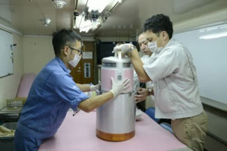 The double-walled, vacuum-insulated container (vacuum bottle structure) being taken out from the payload storage container recovered from the small re-entry capsule (HSRC) (photo provided by JAXA)