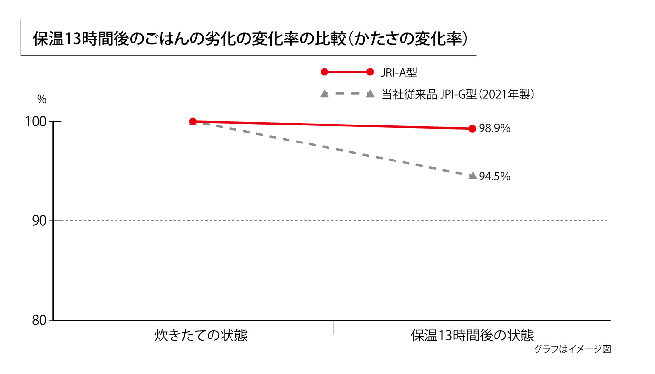 With the TSUBUDACHI keep-warm program, the hardness and stickiness of the rice kept warm in the rice cooker 13 hours after being cooked changes less than those of rice kept warm in our conventional rice cooker*. You can enjoy rice as delicious as freshly cooked rice even hours after the rice is cooked.