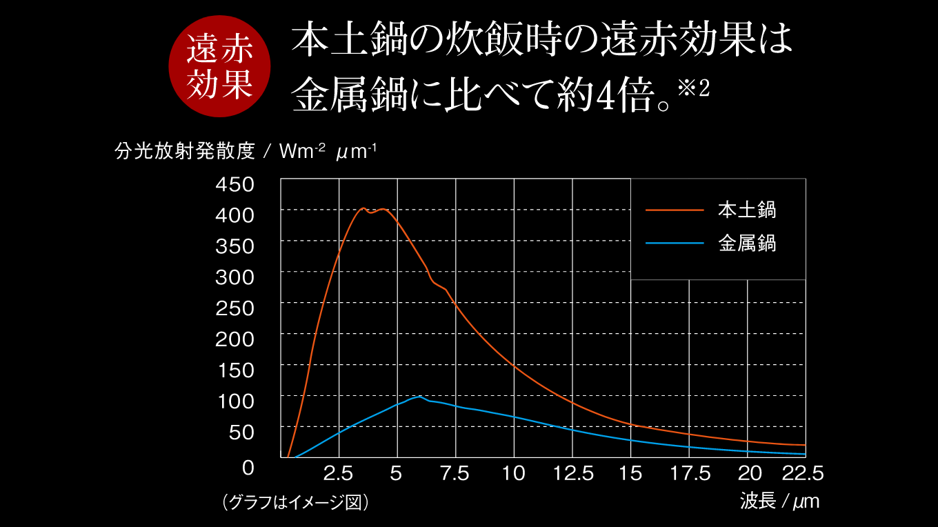 *2 Based on a comparison of the inner pots between JRX-T100 and the conventional Tiger product JKT-P100 (2022 model). Temperature taken from the inside of the bottom of the pot. This is a comparison of the amount of far-infrared radiation energy at peak temperatures for an authentic donabe at 230℃ and a metal pot at 110℃ (presumed temperatures for cooking rice). JRX-T100: 397.6 Wm-2 μm-1 JKT-P100 97.7Wm-2 μm-1, JKT-P100: 97.7 Wm-2 µm-1 (based on our research)