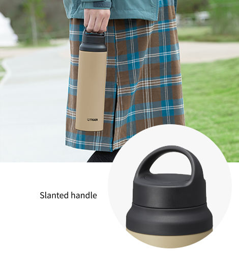 The slanted handle designed to be easy to hold and secure fits your fingers comfortably when you hold the handle. You can securely carry the bottle filled with a drink.