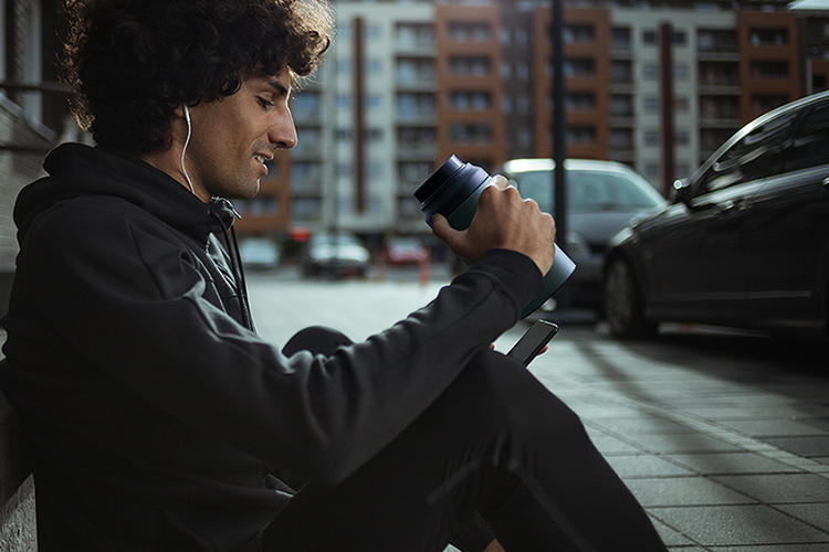 While a “new common sense” has been spreading, the way people spend time in the cities is changing. The mug bottle with an easy-to-hold handle allows you to carry the bottle while on the go. The bottle has an elastomeric bottom, making it difficult to slip on or damage the surface of a table when you are working from a cafe. As no sound is made every time you put the bottle on the table, you can concentrate on your work.