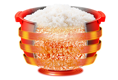 The high heat generated by induction heating (IH) is quickly and directly transferred to the rice.