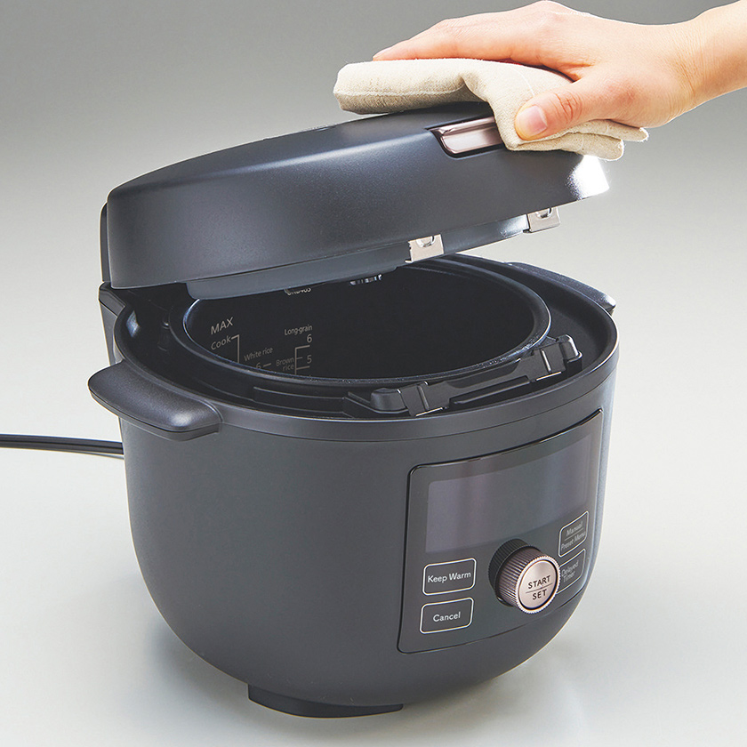 The pressure lock can be turned on/off with a single touch of the button. The lid does not open when the pressure lock is on so that you can use the cooker safely.