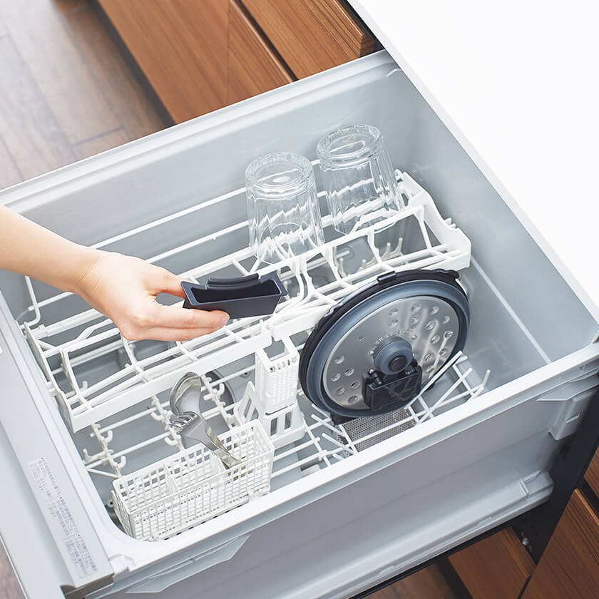 There are only three parts to clean: the inner pot, drip pan, and inner lid. The drip pan and inner lid are dishwasher safe so that you can easily clean them after use.