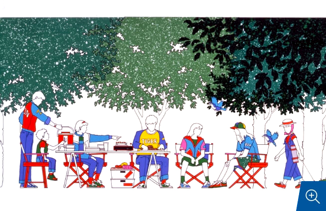タイガーさんとの出会いは、僕がまだイラストレーターをしていた1985年までさかのぼります。時代を代表する俳優を常に起用し、新しい生活スタイルを提案している会社というイメージがその頃からありました。食事やくつろぎ、リビングやダイニング、アウトドアといったシーンから、抹茶やケーキ、ピザ、鉄瓶などあらゆる絵を10年以上かけて、ほんとうにたくさん描きましたね。
