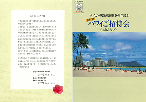 1979年よりご縁をいただき、もう44年のお付き合いになります。1983年に創業60周年記念事業としてハワイで開催された全国代理店大会には、弊社相談役が夫婦でご招待をいただきました。ヘリコプターから撒かれた大量の花びらによる歓迎セレモニーや、当時CM出演されていた古手川祐子さんとご一緒できたことなどを楽しく語っておりました。また2015年には、菊池社長、野口専務とご一緒させていただいた長岡大花火で「タイガーはこれからもタイガーでしかできない技術を提供していく」とお聞きした言葉が、今でも深く私の記憶に残っております。