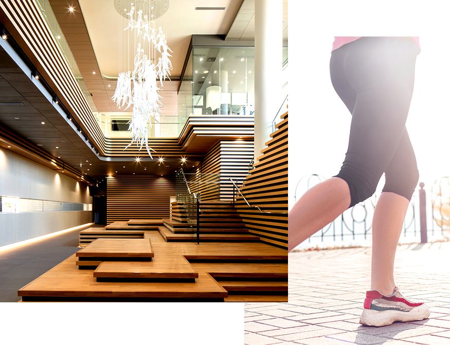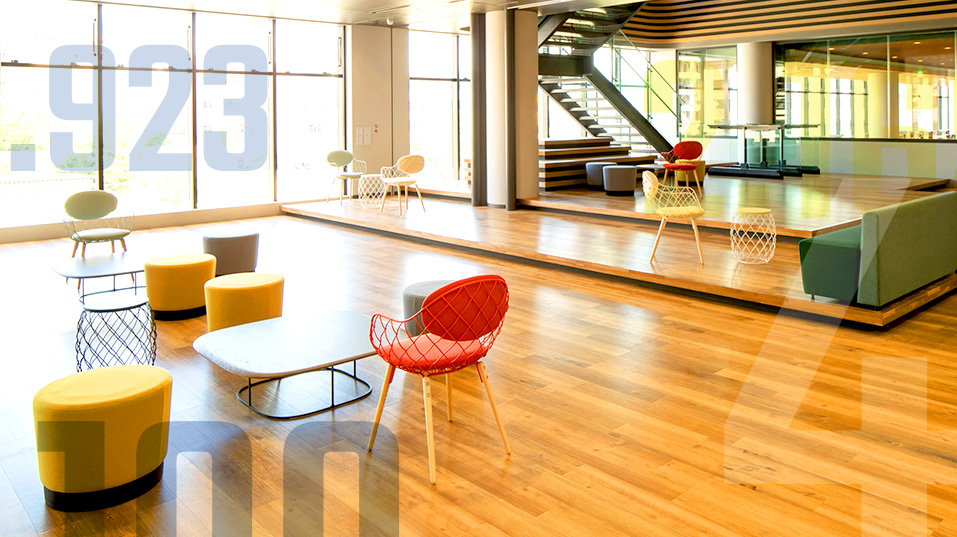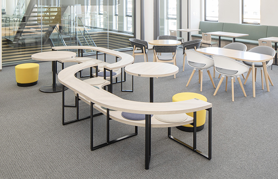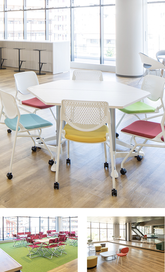 2階〜5階の中央吹き抜け階段横に配置し、南北の執務エリアをつなぐ、明るく居心地の良いラウンジ空間。部署の垣根を越えた自由なコミュニケーションを促します。