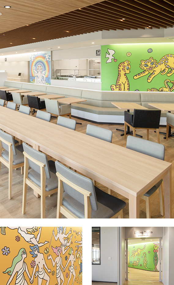 豊かな太陽光があふれる空間。壁画はアパレル大手BEAMS等でデザイナーを務めるミック・イタヤ氏によるもの。細部にわたり社員の休息と憩いの場としての工夫がこらされた社員に人気の食堂です。