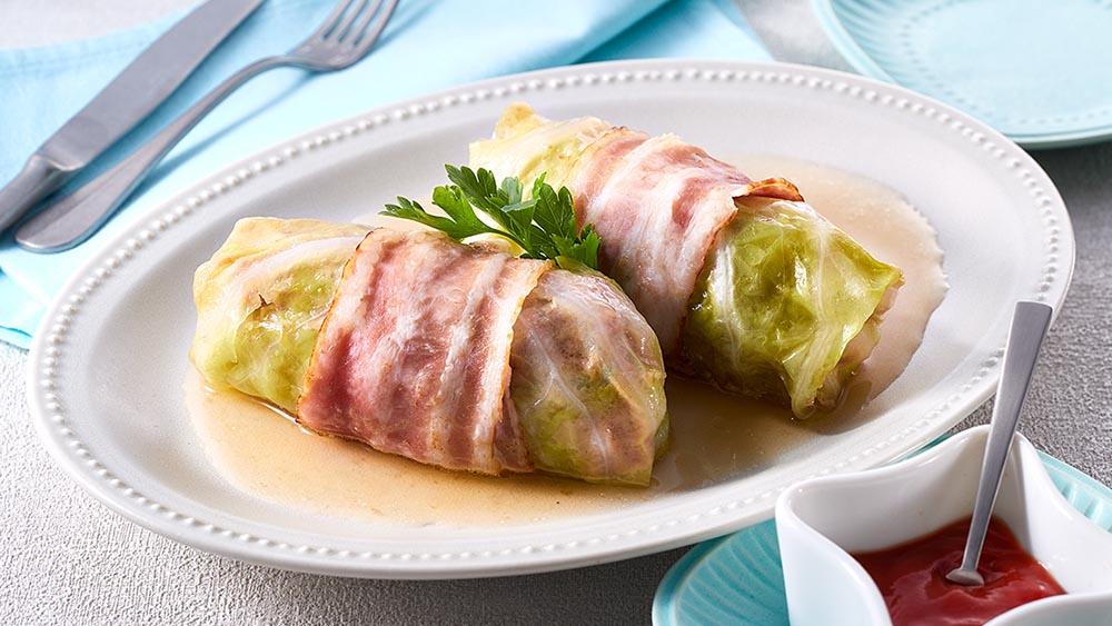 1のキャベツの芯を削ぎ取り、内側に小麦粉をつけて4を4等分にしてキャベツの上にのせて包む。これを4個作り、ベーコンで一巻きしてつまようじで止める。