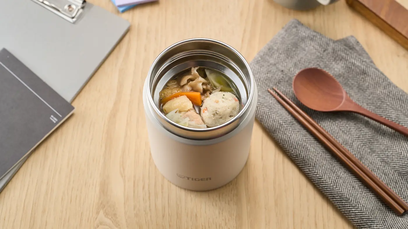 フードジャーに熱湯(分量外)を入れ、ふたを閉めて30分以上保温する。