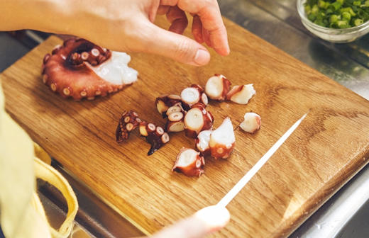 「生食用ゆでだこだから、しっかり火が入らなくてもOK。火を通し過ぎると硬くなるので気をつけて」
