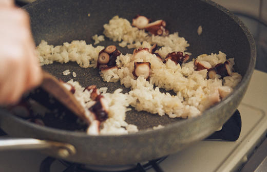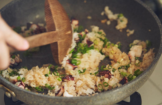 「残りごはんは、炊きたてのごはんより粘りが少なくほぐれやすいから、パラパラっとしたチャーハンを作るのに最適なんですよ。今回はそこにプリッとしたたこで歯ごたえを追加してみました!」と山口さん。それでは早速、「たことねぎのガーリックチャーハン」を作っていただきましょう。