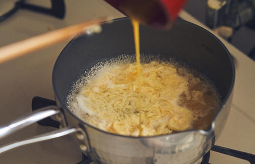 「溶き卵は2回に分けて入れると、素早く火が通ってふわふわに。入れてすぐ混ぜずに、2秒程経ってから混ぜるのもポイントです」