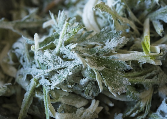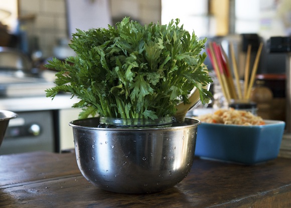 - 春菊は茎と葉を分け、茎は斜め切りにスライスする。