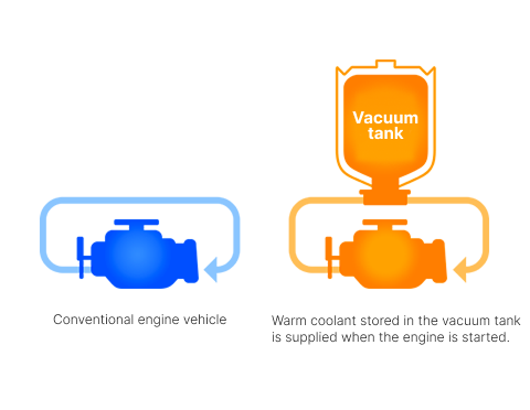 The vacuum tank keeps temperature of the coolant for hybrid vehicles. The system contributes to reducing emissions to protect the global environment. When an automobile engine is cold, such as at startup, it operates less efficiently than when the engine is running normally at high temperatures. This system stores engine coolant heated during driving in a vacuum tank, and when the engine is restarted, the warmed coolant in the vacuum tank is efficiently supplied to the engine, quickly raising it to the optimum temperature for improved efficiency.