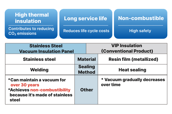 Because the interior is in a vacuum, it achieves an excellent thermal conductivity of 0.0025 W/m·K or less (*1), which is approximately 10 to 25 times higher than conventional insulation materials.