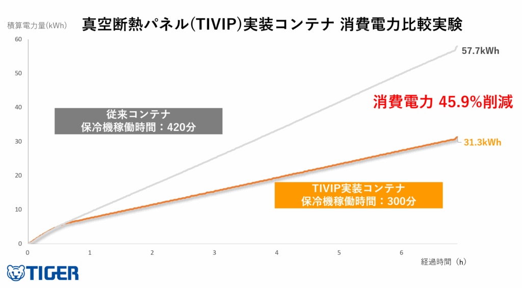 In Kobe City, Hyogo Prefecture, on a summer day with an average temperature of 32.3 degrees Celsius, an experiment was conducted to measure the power consumption of a container with TIVIP installed and a conventional reefer container over 7 hours. With the cooler set to maintain an internal temperature of 5°C, the cooler in the conventional container ran continuously for the entire 7 hours (420 minutes). In contrast, the high insulation capacity of the TIVIP-equipped container reduced the cooler’s operating time to 5 hours (300 minutes), securing a total of 120 minutes of non-operating (OFF) time. This superior insulation performance achieved a 45.9% reduction in power consumption and CO₂ emissions.