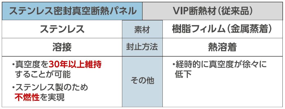 Due to this characteristic, it is expected to be used in fields that prioritize energy savings and space efficiency. Furthermore, the use of stainless steel makes it possible to achieve non-combustibility and maintain high insulation performance over a long period, which was not possible with conventional non-stainless steel vacuum insulation materials.