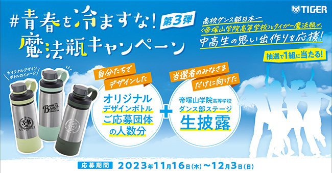 This campaign is designed to help students who are graduating from high school to remember the warmth of their ideas, and how Tiger Corporation, which has been refining its “temperature” technology for 100 years, can make even a small contribution to their memories. The winner of the campaign will receive an originally designed bottle of the winner’s choice as an item that reminds them of the “warm memories” and “strong bonds” of their youth and pushes them forward into the future. This project is part of the “#Seisyun wo samasuna! Vacuum Insulated Bottles Campaign Vol. 3,” with entries being accepted from November 2023.
