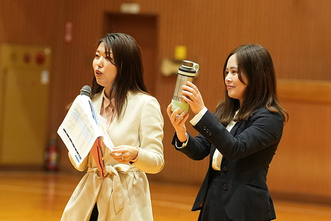Moved by the teacher’s passion for his students and the positive attitude of the students, who were enjoying their student life and taking on new challenges, we decided to select Kurashiki Suisho High School as this year’s winner and hold a surprise bottle presentation ceremony to make it a memorable event for the students before graduation. In addition to the surprise for the graduates, the head teacher of the school wanted to present matching bottles to the teachers who had spent three years with the students, so a total of 342 original bottles were presented to the graduates and teachers, designed with the words “for what?” of the school year goals. In addition, the “#Seisyun wo samasuna! Vacuum Insulated Bottles Campaign” ambassadors, the Tezukayama Gakuin High School Dance Club also made a surprise appearance and performed a passionate and moving stage performance.