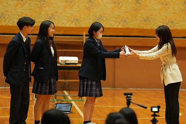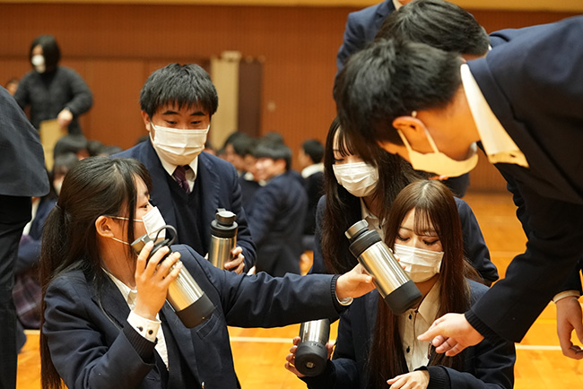 The bottle presented by Tiger Corporation to the graduates of Kurashiki Suisho High School is a bottle with an original design that includes the school year goal, “For what?”, a phrase that all students and teachers have kept in mind throughout their three years of high school. Mr. Mae said, “I hope that students will keep these words in their hearts and play an active role in society, no matter how hard things get in their lives. He also said, “I hope that you will be active in society while keeping these words in mind.