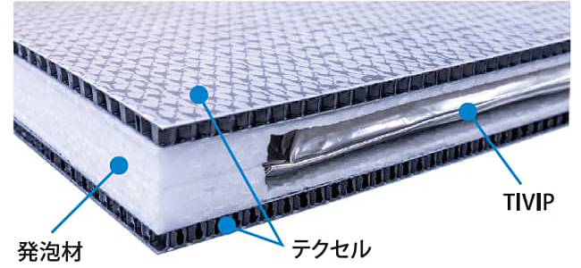 大阪・関西万博内での活用においては、当社が新開発したステンレス密封真空断熱パネル「TIVIP」を岐阜プラスチック工業の軽量・高強度素材である樹脂製ハニカムパネル「テクセル」でサンドイッチすることで、TIVIPを保護し軽量かつ強固な断熱ユニットパネルとなっております。