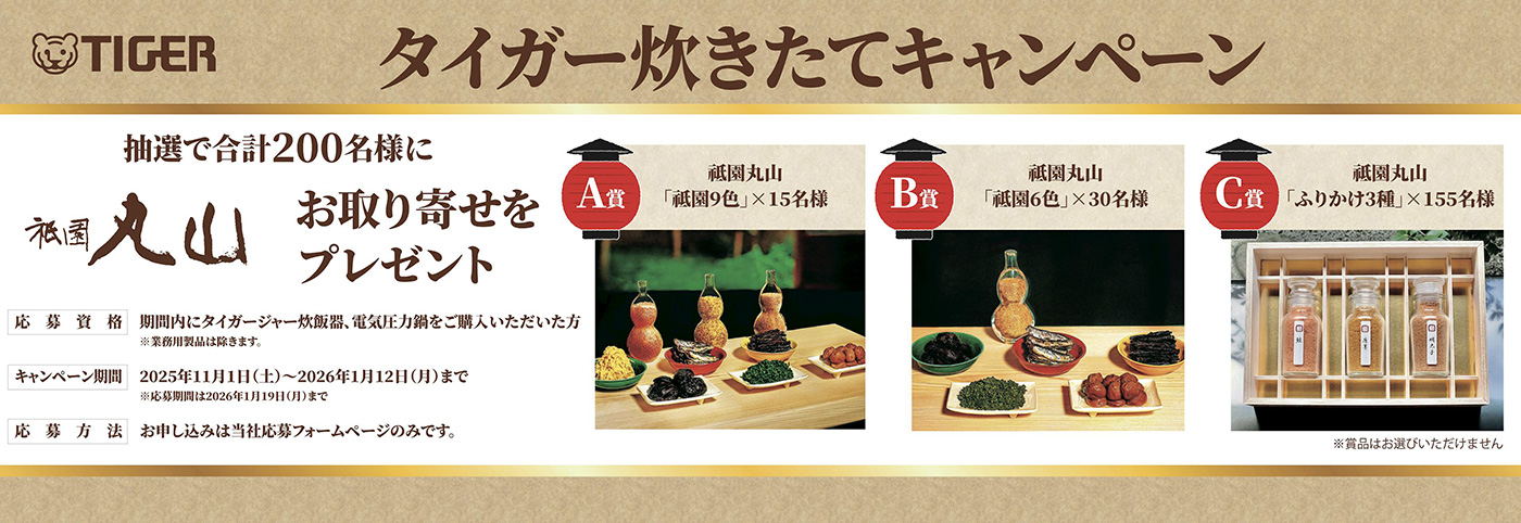 これを記念して、タイガー魔法瓶の炊飯器を期間中にご予約・お買い上げの上、キャンペーンにお申込みいただいた方を対象に、京都の伝統と文化を独自の美意識で表現し、伝統を継承しながら進化を続ける京料理にこだわる料亭「祇園丸山」のお取り寄せを抽選で200名様にプレゼントいたします。祇園丸山の独自技術で仕上げたふりかけ、漬物、佃煮のセットをはじめとして、今回ご用意する厳選素材にこだわった品々は大切な人への贈り物としても選ばれる逸品です。