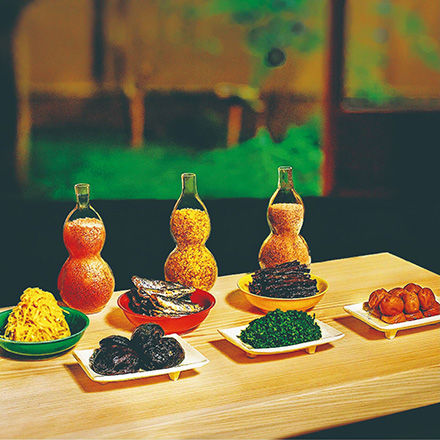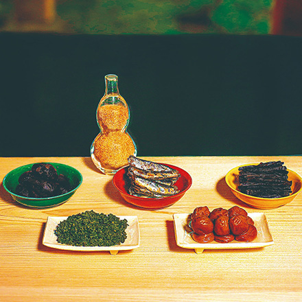 内容:ふりかけ3種(鮭、唐墨、明太子)、ハリハリ大根、鰯、山吹、椎茸 、花・実山椒、小梅