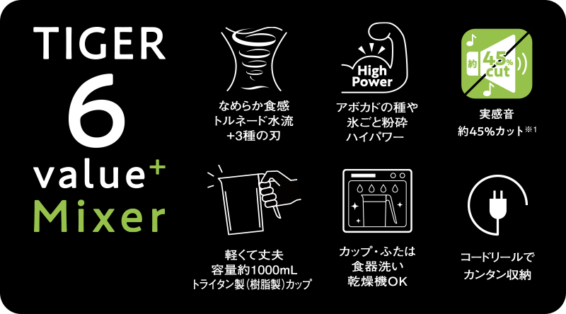 Tiger’s unique “tornado water stream” technique to mix the ingredients evenly at the top and bottom + black titanium-coated six-blade cutter