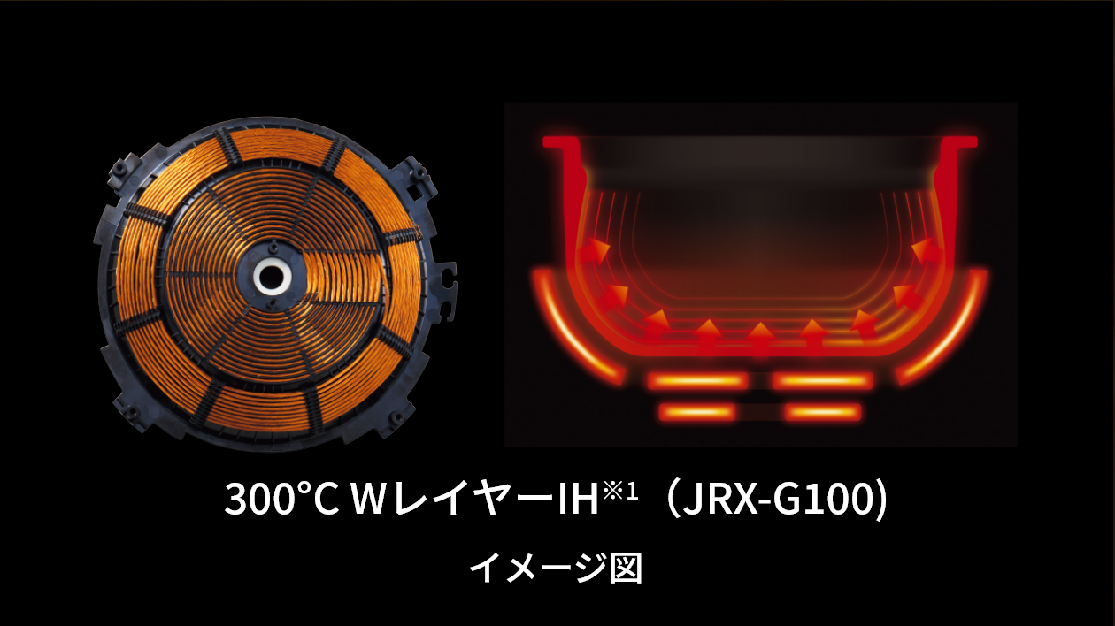 The rice cooker has the industry’s first new 300℃ double-layer IH structure*1(JRX-G060 has the 250ºC double-layer IH structure*1.) The double-layer IH and seamless structures help to increase the heating power.