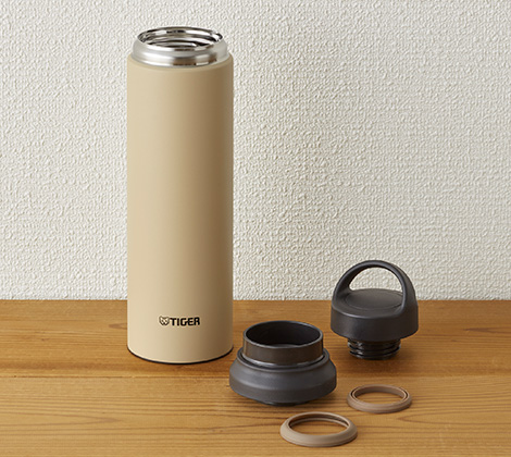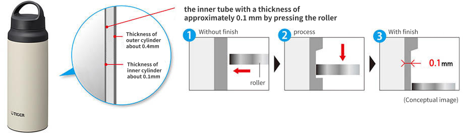 The inner bottle material was thinned to the utmost limit (about 0.1 mm) using Tiger’s proprietary spinning technique, achieving a light weight suitable for carrying.