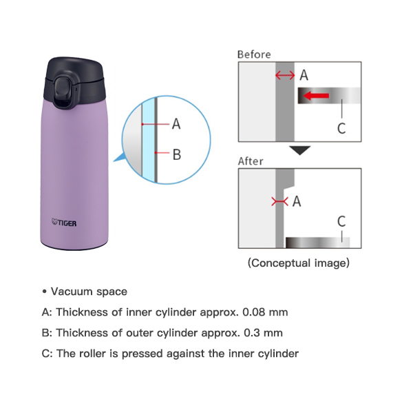 Tiger’s proprietary stainless-steel spinning reduces the thickness to produce an extremely light bottle. The 0.35 L size weighs approximately 170 g, the 0.5 L size approximately 210 g, and the 0.6 L size approximately 230 g, making the lightweight bottle ideal for carrying around when you’re out and about.