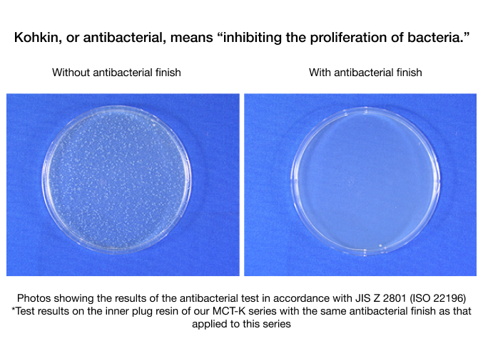 In most cases, bacteria adversely affect humans when they increase massively in excess of a certain amount. The antibacterial finishing prevents the growth of bacteria so that the product surface can be kept hygienic. For the MCT-K series, on the stopper and outer surface of body with the antibacterial finish, the growth of bacteria is prevented by 99% or more, compared with untreated ones; this means the bottle can be used hygienically at anytime. (Excluding the interior of the cylinder.)