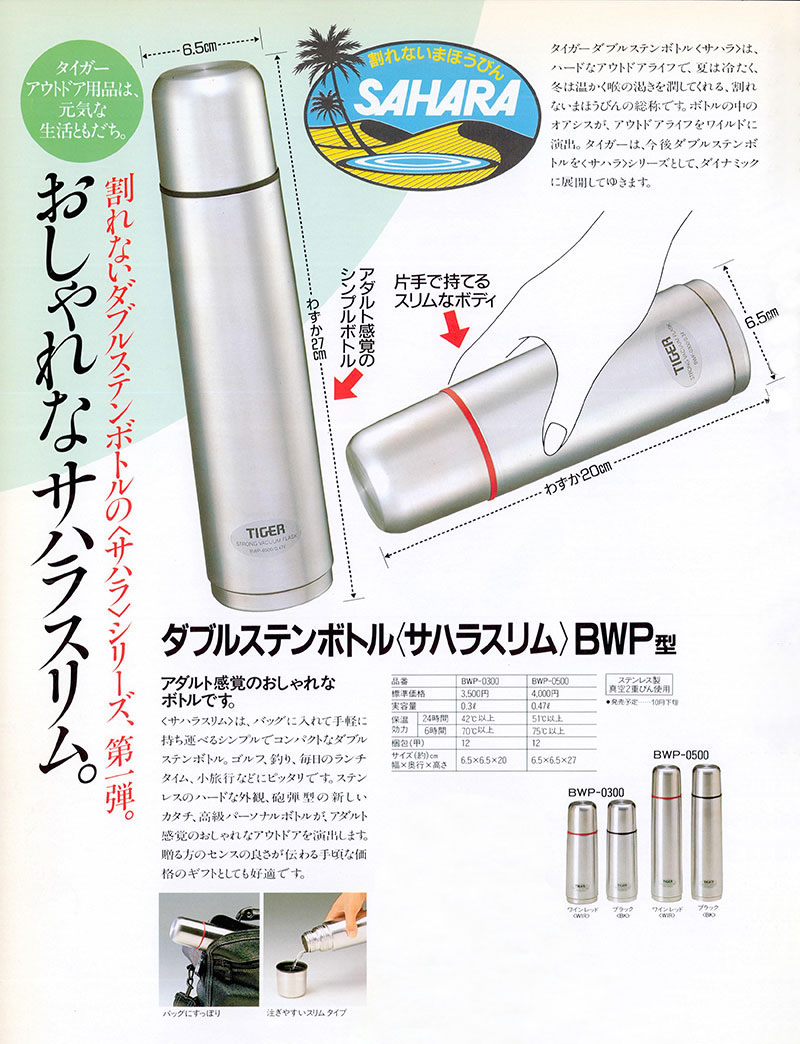 The "Five-fold Power Vacuum Bottle" was launched in the early days of the company and went on to become a popular product further down the road, but at the time of its initial release it was still only useful for hiking or traveling, and domestic demand was low. However, the company continued to develop new products. These included a baby bottle with a teat over the opening (thermal baby bottle), and a vacuum bottle for sake that kept the sake inside warm. Many other amazing products went on to be developed, such as a container for ice cream, and a vacuum bottle for ayu fishing to refrigerate and transport freshly caught fish.