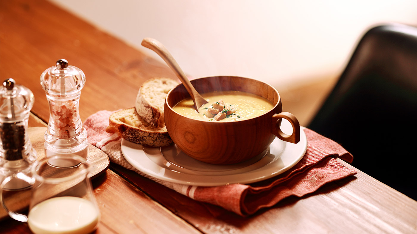 This is the easy part! Just place the drained canned corn and soup stock inside your Tiger blender and set the speed dial to level 10 for three minutes. Then transfer to a soup pot with milk and bring to a boil. Season, turn the heat off and mix in heavy cream. And that’s it! We told you it was easy. It’s one of those simple soup recipes that tastes even better than the sum of its parts.