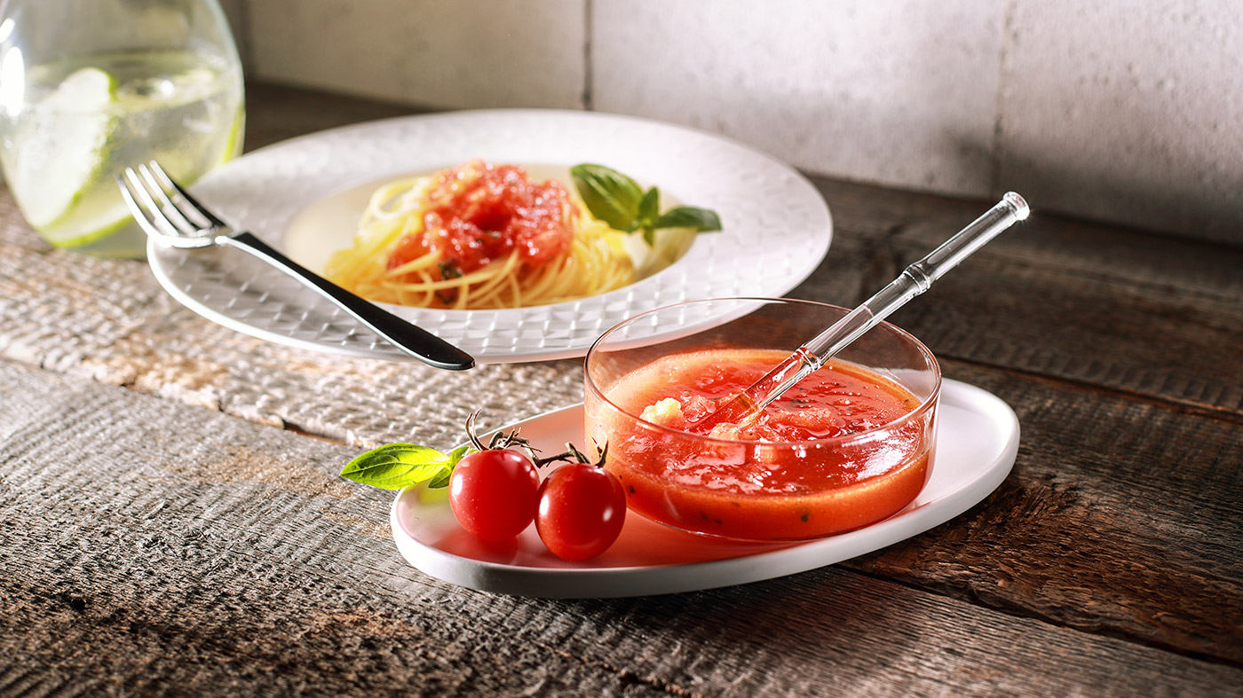 Gently score the underside of your tomatoes by making an X with a knife. If you boil them for 5 seconds and plunge them into an ice bath afterwards, the tomato skins will easily peel right off. From that point, simply load everything into your Tiger blender and blend for a minute on speed 2.
