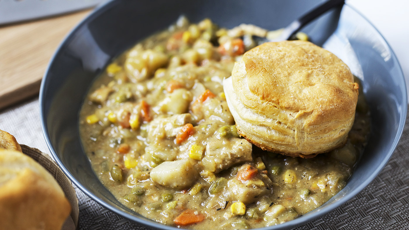 - Serve chicken pot pie with biscuits on top.