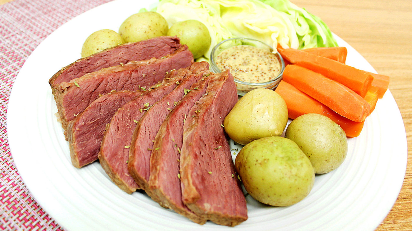 - Thinly slice the corned beef and serve with vegetables on a plate. Garnish with mustard if desired.