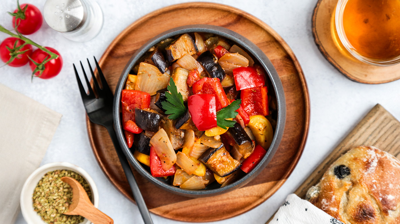 The best Mediterranean recipes follow a simple coda. Use high quality ingredients – and let the natural flavors speak for themselves. Our ratatouille recipe sticks to those ancient basics, and in the process, becomes something greater than the sum of its parts. It’s a rich vegetable stew, perfumed with tangy and sweet tomatoes and herbs where each ingredient manages to shine. We’re big fans of the zucchini and peppers. But no ratatouille is complete without perfectly sauteed eggplant.