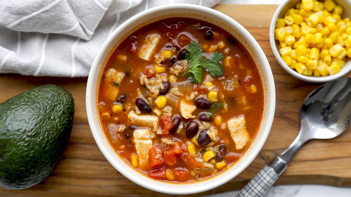 Indulge in south-of-the-border deliciousness with this smoky, savory and healthy taco soup recipe. Loaded with chicken, rice and beans – it’s as filling as it is yummy!