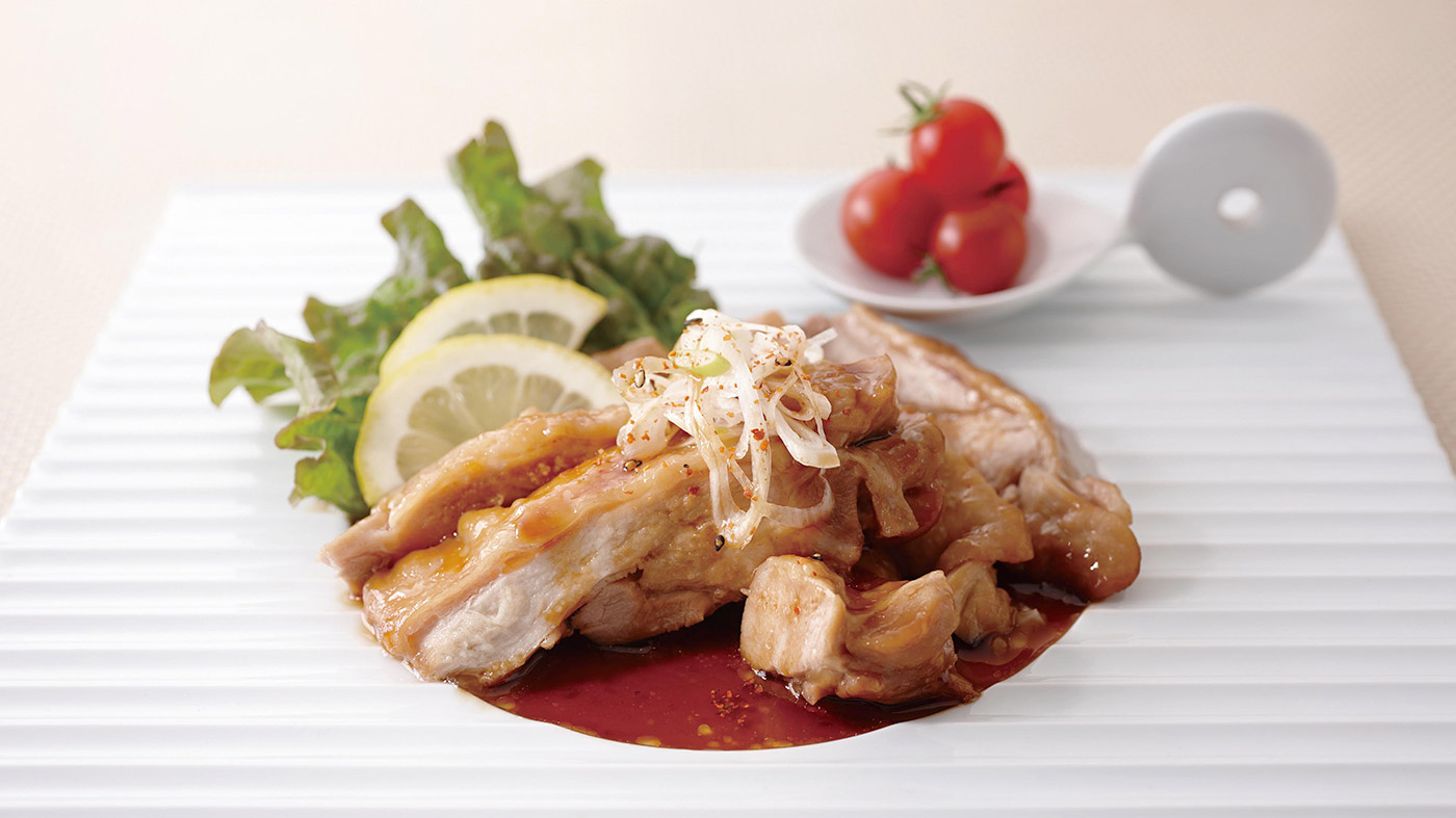 - When cooking is complete, serve the chicken and the garnish ingredients on a plate. Season with shichimi peppers as desired.