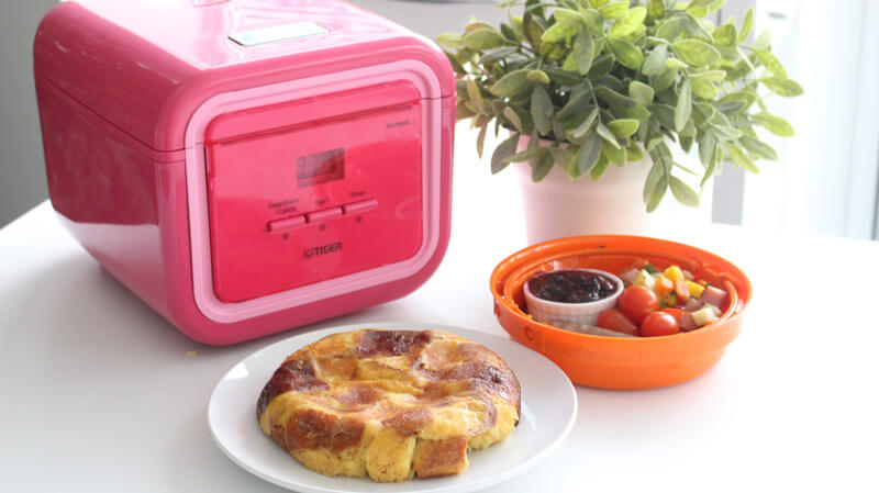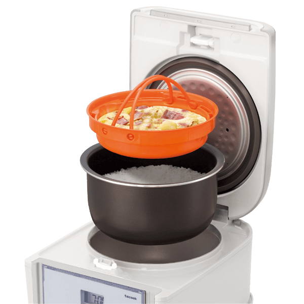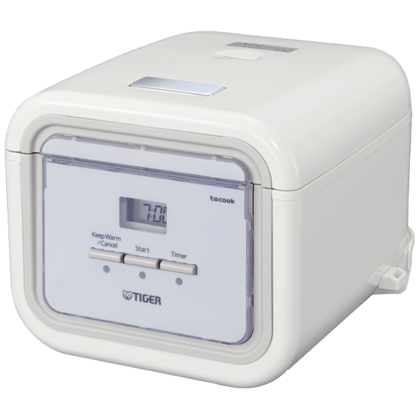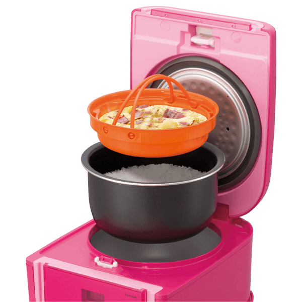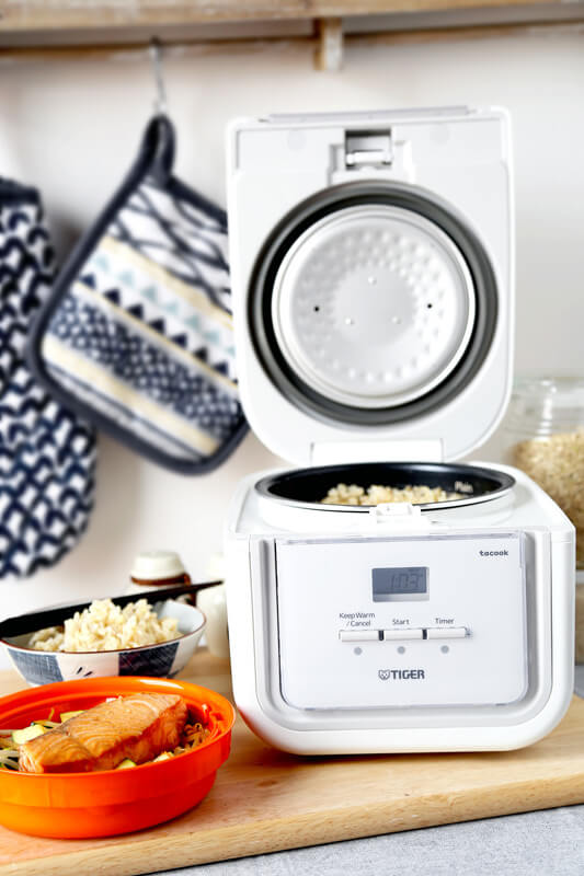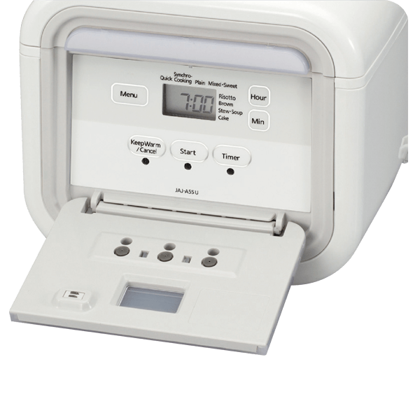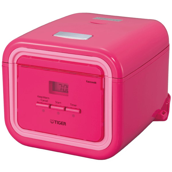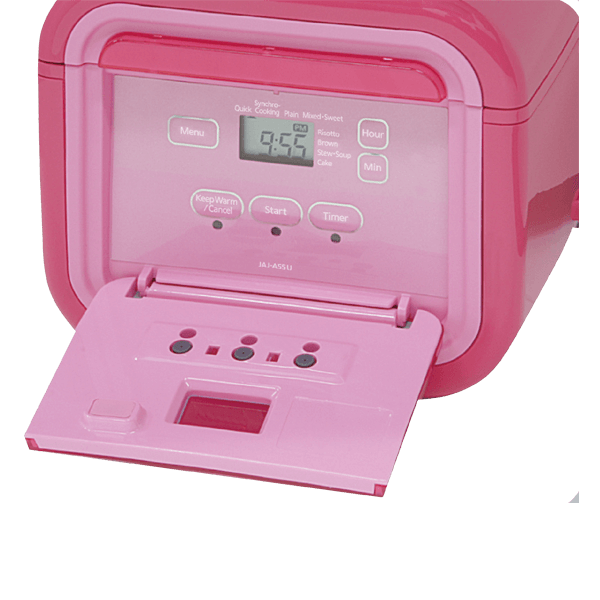 Available in pink or white, the JAJ-A55U electric rice cooker with its modern square design, will be a welcome addition to any kitchen. It is small enough to display on a counter, even in the smallest kitchens. A drop-down front panel reveals the easy-to-use micro-computerized menu settings. Tiger rice cookers with the tacook cooking plate can cook two dishes simultaneously. They use the “Synchro-Cooking” function with an included BPA-free plastic cooking plate, which sits over the rice inner pan and cooks a main dish.