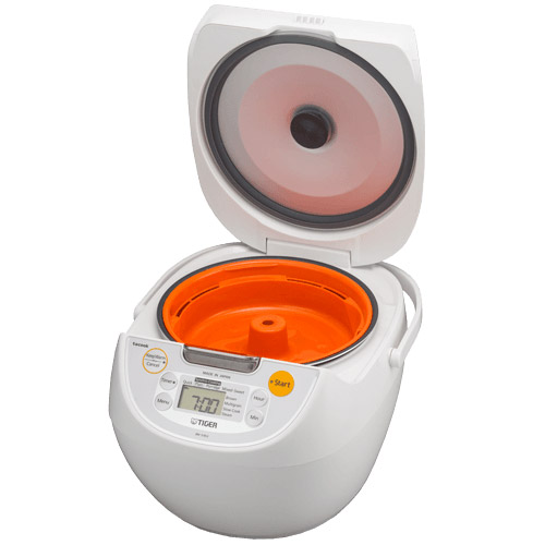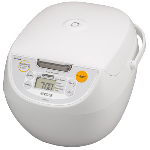 The TIGER JBV-S multi-functional electric rice cooker allows you to prepare two dishes simultaneously with the exclusive tacook synchronized cooking function. With minimal preparation and the press of a button, Tiger’s Automatic Cooking Logic™ system actively monitors cooking temperatures to create the perfect meal. Unlike other rice cookers, Tiger’s cooking plate is specially designed so the flavors from the cooking plate do not affect the flavor or texture of the rice. Other convenient features include a slow cooker function for stews and soups as well as a porridge function for risottos or rice porridge. Two preset cooking timers allow the user to program cooking times.