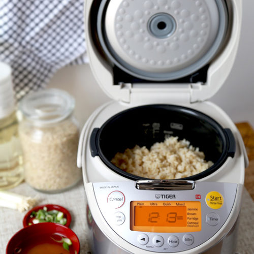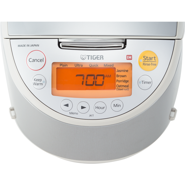 The TIGER JKT-B multi-functional induction heating (IH) electric rice cooker allows you to cook perfect rice with the power of IH. With the press of a button, Tiger’s Automatic Cooking Logic™ system actively monitors cooking temperatures to create perfect rice. With eight computerized menu settings, there is a setting to fit just about any kind of rice. Your morning oatmeal can also be made with the oatmeal setting.