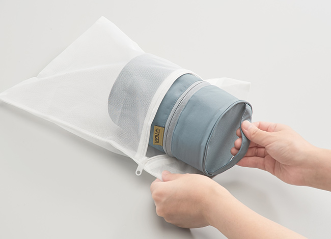 (Put the pouch in a laundry net and select a hand wash option* on your washing machine.)