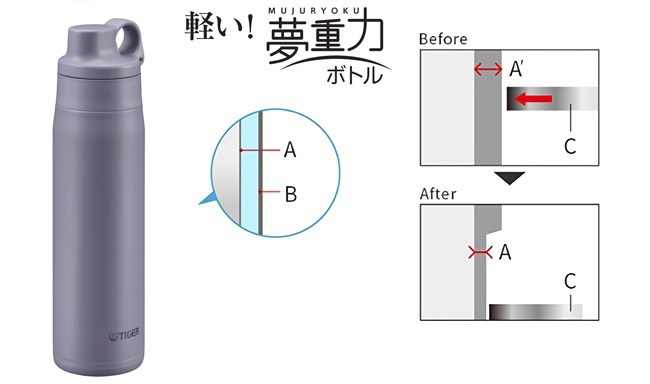 Tiger’s proprietary “Hyper-spin” manufacturing process reduces the thickness (to approx. 0.08 mm) of the inner cylinder to produce a light bottle.