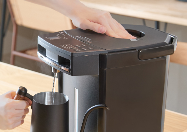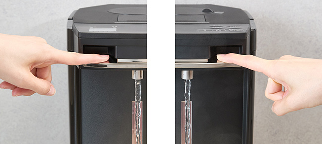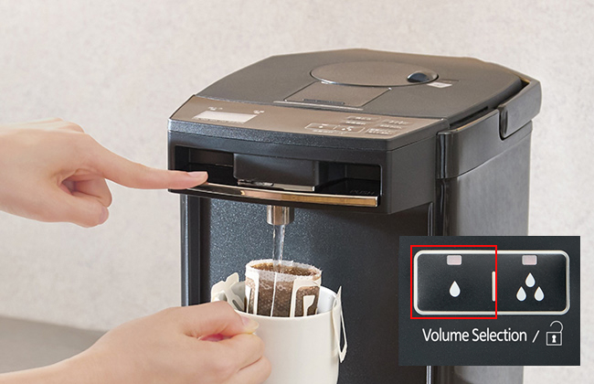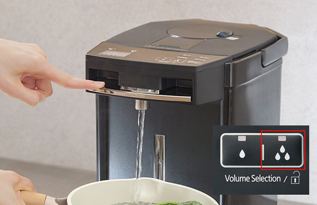 The dispense volume can be switched between the quick “large-volume dispensing” option for cooking and the “slow dispensing” option for pouring a small amount of hot water slowly to make an instant soup or a cup of coffee. You can select either of the dispense volume levels depending on your purpose.