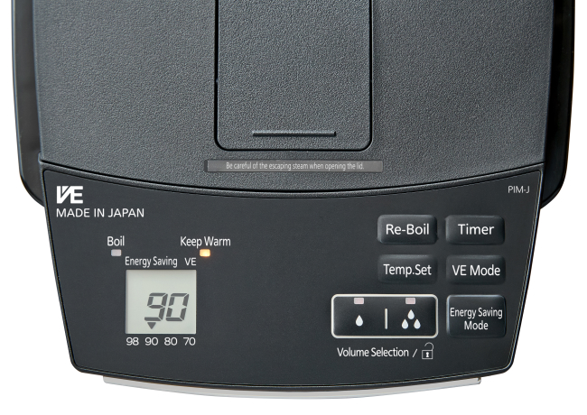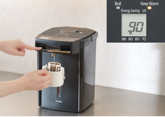 The high-vacuum, double-walled bottle (VE* bottle structure/stainless steel) container has a reliable structure that allows the hot water inside to be kept warm even after the product is unplugged. The temperature is kept to around 90℃ or more even after two hours unplugged!* The product offers excellent energy efficiency and power saving performance.