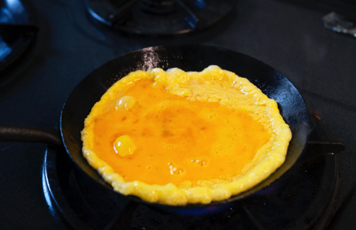 卵料理というのは最初の火加減が何より大切で、油を入れたフライパンをカンカンに熱して、そこに一気に卵液を流し込みます。
