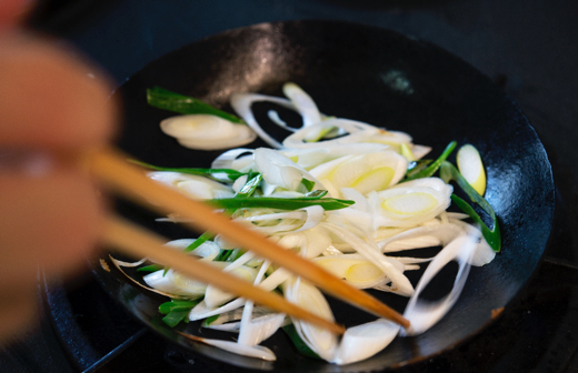 3.フライパンにごま油を弱火で熱し、長ネギを入れて炒める。